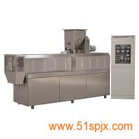 雙螺桿擠壓膨化機具有兩個相互嚙合并同方向旋轉的一對螺桿,它們共同起著輸送、摩擦擠壓和加熱的作用,靠著正位移原理輸入物料,進行強制輸送,很少形成壓力回流,從而較好的解決了單螺桿擠壓式膨化機上這方面的問題,強力輸送。膨化機集壓縮、混合、混煉、剪切、熔融、殺菌、膨化、成型等多種功能一體,在極短的時間內全部完成。模具的變換可以無限變換產品的形態和尺寸,雙螺桿膨化機可以生產線食品品種繁多,可生產休閑小吃食品、早餐谷物食品、夾心膨化食品、即溶米粉、湯料、面包片、組織化植物蛋白、糖果、調味組分、寵物食品、魚蝦飼料等,并且可以開發出無數種新型食品。
