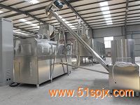 該機由供料系統、擠壓系統、旋切系統、加熱系統、傳動系統、控制系統組成。采用先進的螺桿擠壓膨化技術,利用高溫高壓將物料熟化并膨化成型,一次性完成。主機采用變頻調速,保證生產過程的穩定性。產品花色、品種多樣、外表美觀、自然逼真、質感細膩、原料使用廣泛
