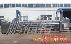 該油炸機前段設計為120攝氏度---140攝氏度低溫油炸區,采用純油設計,不會產生壞油現象,并且油炸槽底部設計有縱向刮渣網帶,可在不斷轉動刮渣網的情況下,隨時將食品渣輸送到低位槽刮渣區,而且低位沉渣區為低溫,所以渣不會產生碳化現象,從而不斷輸送到油炸機外部,這樣就減少伐油。提高生產效率及利潤空間。油炸機采用電加熱一字型加熱管,放置在刮渣網帶上部,輸送網帶下部,這樣加熱在油中間,可徹底避免產生火災現象。起到安全保險作用,輸送網采用最新板塊輸送帶,以方便清洗為準則,保證食品質量,此段油炸機設計上層網帶式,因是低溫油炸,在此段產品也就是剛剛浮起效果。油炸機煙罩設計為半開式,方便產品充分接觸空氣,最好而且油煙不能外溢。提升機構為鑼桿提升,安全美觀并可實現同步。本套油炸機分為低高溫油炸設計。