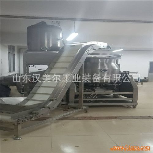 具體步驟為:集中投料-自動提升-真空罐體自動開蓋-自動進料-自動合蓋-自動進油-自動油炸-自動脫油-自動90度傾斜出料-輸送帶自動輸送-根據具體工藝連接拌料機或者直接包裝。