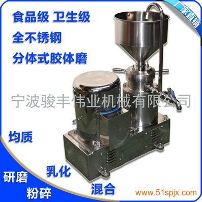 膠體磨分立式、分體等各種規格。其主機部份由殼體、動磨片、靜磨片、調節機構、冷卻機構、機械密封、電機等組成。其主要零件均采用不銹鋼制造,耐腐蝕,無毒。使用單位可依不同物料特性,生產效率,不同用途,選用不同規格型號的膠體磨,使之達到良好的效果。膠體磨結構