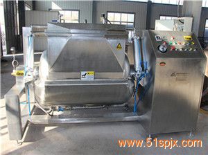 本機使用U型鍋體頂部抽真空,夾套采用燃氣加熱、蒸汽加熱、導熱油加熱、電磁加熱等多種加熱方式,無段變速與蝸輪、減速機的組合轉動,增大了橫軸攪拌的力矩,采用聚四氟乙烯材質刮板的攪拌器,在物料的翻滾攪拌過程中,攪拌器與鍋體的全方位充分接觸,確保了無攪拌死角。鍋體的開蓋、卸料、復位采用電機轉動控制,操作極為方便。真空炒制可降低炒制溫度,特別適用于熱敏感原料的炒制,避免了因過度受熱引起顏色及口味的劣化,保持了原料原有的色、香、味。提高了炒制效率,并降低能耗,縮短了炒制時間。