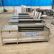 去皮,毛輥清洗機(jī)可以邊清洗邊去皮,電機(jī)轉(zhuǎn)動(dòng)帶動(dòng)毛輥轉(zhuǎn)動(dòng),毛輥和蔬菜摩擦的過程中把皮給去掉,通過提升機(jī),提升出來以后。進(jìn)入氣泡清洗機(jī),氣泡清洗機(jī)的作用是把前面去掉皮的蔬菜進(jìn)行沖洗,去皮后的蔬菜表面還會(huì)有小顆粒的泥沙(俗稱去牙磣)。通過氣泡清洗機(jī)出來一遍之后就會(huì)達(dá)到食用標(biāo)準(zhǔn),