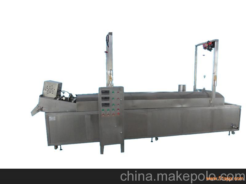 該油炸機前段設計為120攝氏度---140攝氏度低溫油炸區,采用純油設計,不會產生壞油現象,并且油炸槽底部設計有縱向刮渣網帶,可在不斷轉動刮渣網的情況下,隨時將食品渣輸送到低位槽刮渣區,而且低位沉渣區為低溫,所以渣不會產生碳化現象,從而不斷輸送到油炸機外部,這樣就減少伐油。提高生產效率及利潤空間。油炸機采用電加熱一字型加熱管,放置在刮渣網帶上部,輸送網帶下部,這樣加熱在油中間,可徹底避免產生火災現象。起到安全保險作用,輸送網采用最新板塊輸送帶,以方便清洗為準則,保證食品質量,此段油炸機設計上層網帶式,因是低溫油炸,在此段產品也就是剛剛浮起效果。油炸機煙罩設計為半開式,方便產品充分接觸空氣,最好而且油煙不能外溢。提升機構為鑼桿提升,安全美觀并可實現同步。本套油炸機分為低高溫油炸設計