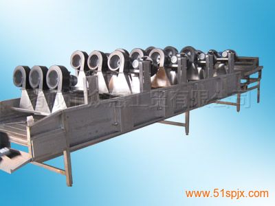 工作原理:物料通過網帶傳輸進入,經多次翻轉,以實現物料的多面受風及受風的均勻性,通過吹風機的高壓風力將食品冷卻或將表面水分吹干,風嘴成風刀狀,有效地提高了風量壓力,使物料表面的水分在短時間內吹走或蒸發,便于儲藏或深加工。
