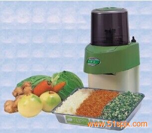 本機是實用新型的一種蔬菜切碎機,它包括機體、切碎裝置,電機和傳送系統;切碎裝置中的粗、中、細切的切刀為一種螺旋體切刀,可繞同一軸心線以同一方向但不同速度旋轉,形成一種速差剪切功能。被切碎的蔬菜由帶孔的出口體離出,被切的蔬菜顆粒比較均勻,沒有連刀塊,而且菜也不糊,用它們做成的菜餡吃口好,適用的菜的品種也較多,如卷心菜、辣椒、蘿卜等均可,是一種比較理想的蔬菜切碎機。