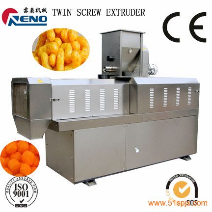 二、設備配置:立式急速粉料攪拌機→雙螺桿干式擠壓膨化機→整形切斷機→自動連續油炸機→滾筒調味撒粉→包裝機