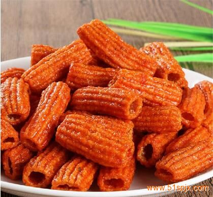 原材料攪拌-擠壓膨化熟化成型-烘干-表面噴糖+撒調味料-再烘干-冷卻-包裝
