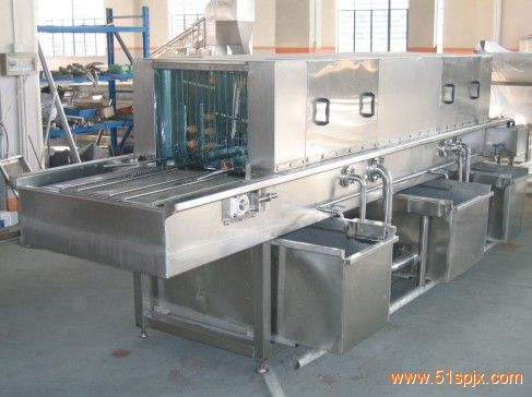 清洗分為三段第一段為熱堿水,第二段為熱清水,第三段為自來水。三段噴淋水除第三段自來水外都有獨立循環過濾水箱,第三段自來水作為補充水回收至第二段水箱加熱使用過后部分污水被自動排出。第二水箱內設有蒸汽加熱管,溫度從常溫至100°C自由設定、自動恒溫。清洗室兩側為活動防水門,兩頭進去筐口采用軟門簾密閉防水,方便隨時清洗檢修設備設備電控箱為不銹鋼制作,所有動力集中控制