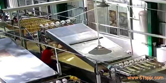 4、自動烘烤: 出來的腐竹,它會自動一桿一桿擺在涼架上面,只要擺夠31桿.它會自動進入烤箱,先進入90/100高溫區,等涼架再一次擺滿下架時,第一架腐竹進入70/75中溫區,第三架腐竹下架時,第一架腐竹會進入60度左右的恒溫區,如果這個時間段溫度在高的話,最容易出現外干內濕,腐竹容易烤紅變色沒有光澤,恒溫區是為了讓腐竹在保持色澤鮮亮事,在恒溫區把腐竹內部的水分蒸發出來,包裝以后,儲存時不容易發霉.