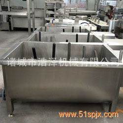 攪拌燙缸自動恒溫浸燙池是禽類宰殺的重要設備,適用于脫毛前的浸燙工序,采用封閉箱體式結構,蒸汽熱交換方式加熱,水溫自動控制,機械、氣流雙重攪拌,經該浸燙后的禽體脫毛效果極佳,體表不受損害,胴體色澤新鮮,是一種較為理想的禽類體表處理設備。