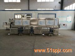 5.設備概述:本機開啟后,由人工送料至噴淋清洗機鏈條軌道或由輸送連接自動進料,先進行堿液噴淋,然后熱水噴淋,再進行清水循環噴淋,三組各自獨立,外置循環水箱,過濾網可方便抽取。周轉箱沖洗進口由人工操作。