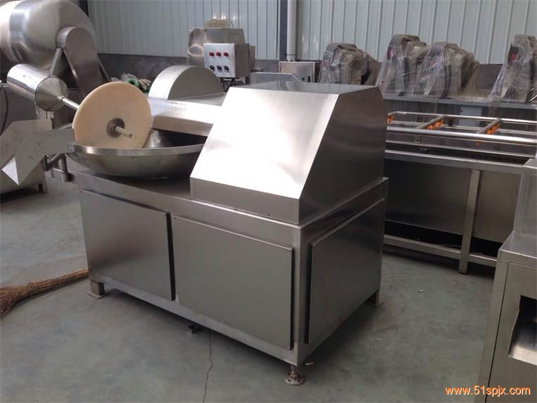 2、首先在加水和加冰之前先進行干斬切是非常必要的。當組織較干的時候,肌肉纖維比較容易斬切,肌肉組織被切斷之后,斬拌機的運行效率就會提高很多。如果所有的細胞都能進行破壁,然后再把游離出來的細胞結構斬碎,會有事半功倍的效果,但斬拌機的高速運轉容易引起物料溫度升高,當溫度高達一定程度的時候就會使物料的性質發生改變,因此斬拌機的干斬要控制在一定的限度內,只有對冷凍的物料或者是耐高溫的物料才可以進行斬拌。肉餡大都含有20%到35%的脂肪,可以通過斬拌機的不斷作用下構成穩定的蛋白質-水-脂肪結構的混合物,當脂肪含量高于這個數值時,蛋白質網絡就需要變得更強,這種穩定的混合物就難以形成。