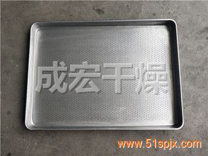 標準盤外形尺寸為:640*460*45mm,為模具一次沖壓成型,烘盤常規厚度0.5mm,還有加厚型0.6mm、0.7mm、0.8mm、0.9mm、1.0mm。另外為了增加透氣性可沖孔,孔徑1-10mm供用戶選擇,制作工藝有卷邊盤,直邊盤,新版GMP卷直邊。
