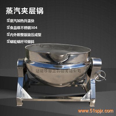 夾層鍋按加熱方式分為蒸汽夾層鍋,燃氣夾層鍋,電加熱夾層鍋,電磁加熱夾層鍋。蒸汽夾層鍋以一定壓力的蒸汽為熱源,中間夾層通入熱源使鍋體受熱。夾層鍋具有受熱面積大、熱效率高、加熱均勻、液料沸騰時間短、加熱溫度容易控制等特點。夾層鍋鍋內層鍋體(內鍋)采用耐酸耐熱的奧氏型不銹鋼制造,配有壓力表和安全閥,外型美觀、安裝容易、操作方便、安全可靠。