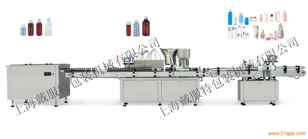 本生產線由DTLP型全自動理瓶機、DTGXZ-I型直線式灌裝旋(軋)蓋機、、DTTL型立式貼標機組成,可完成理瓶、灌裝、旋(軋)蓋、貼標打碼等工序,主要用于大劑量溶液的聯線生產.