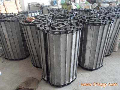 鏈板網帶非常堅固,鏈條驅動,用于中等和大負荷輸送。鋼板彎曲形成合葉,使用支軸將合葉和鏈條串在一起。