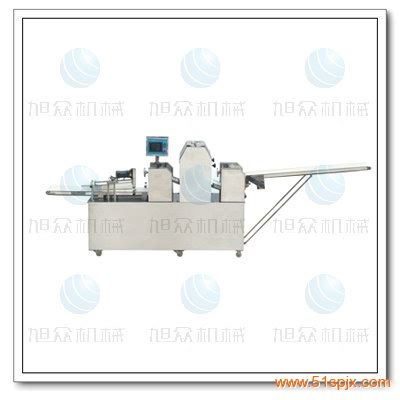 工作時由輸面機構輸送到壓面機構,再送至出餡機構,用卷面機構把壓過的薄面與餡卷在一起形成二合一的包餡面柱。然后輸送到切刀部分由光刀把面柱擠壓,形成餡面球,再把餡面球送到成型部分。再把含餡面球壓扁變成一個個的大小均勻酥餅。