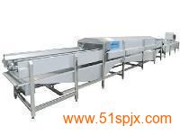 功能:將產品進行浸泡式清洗,借用氣泵進行翻動,清除雜物出料時進行噴淋清洗。 參數:采用1.5mm厚度的 304不銹鋼板制作,輸送電機1.1kw,氣泵 0.55kw 控制方式:電器控制,網速可調
